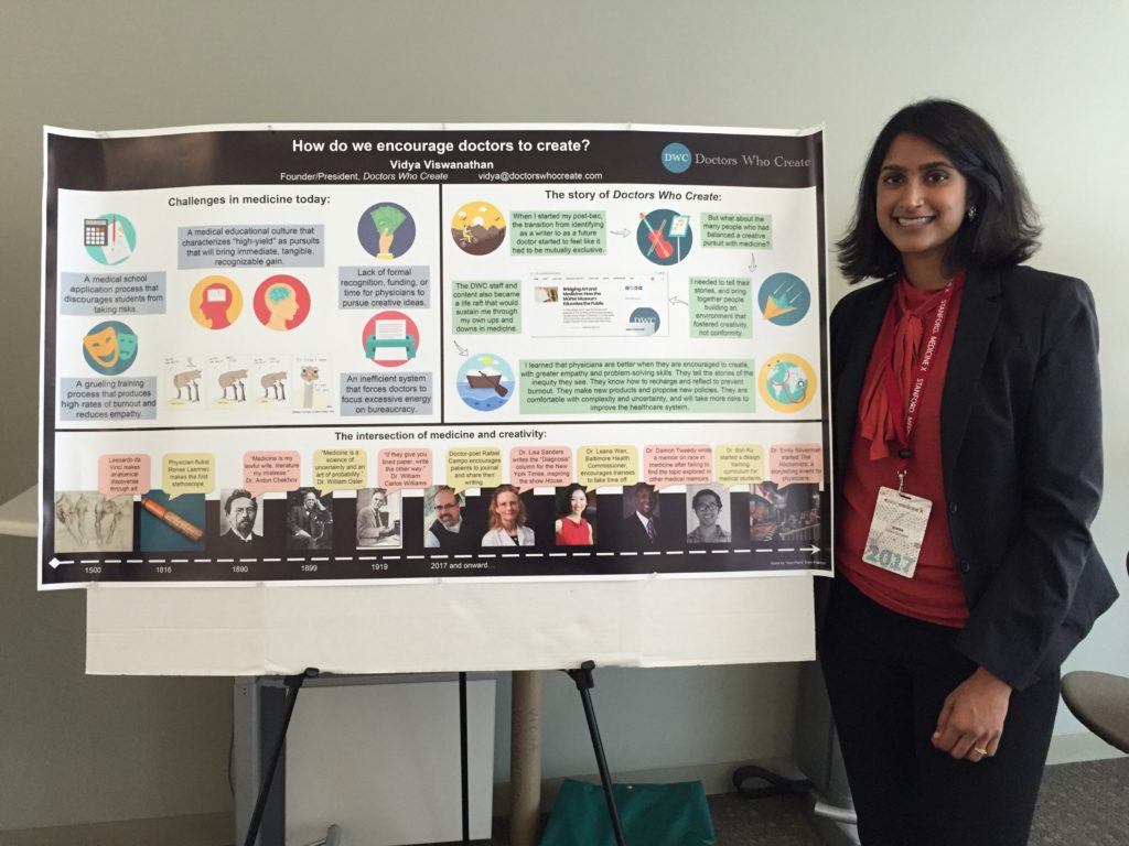 I was a bit nervous standing by my poster waiting for people to stop by and ask me about it. It was not a research poster, like most of the others – there was no formal hypothesis, data, collection, or results. But I had explored all those concepts, informally—I had identified challenges in medicine today, interviewed many, many creative physicians in an attempt to understand how they overcame those challenges, and as a result formed the Doctors Who Create community. It was exciting to see people walk by the poster, have it catch their eye, and get into long and interesting conversations with them about burnout, risk-taking, and innovation in medicine. Many even asked to take pictures of the poster.